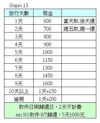出租商品及報價 GoPro出租 首頁 > 商品 > GoPro出租 > GoPro Hero 13 出租 GoPro Hero 13 出租 系統報價已包含取還2天不計費,請於出國前1天取件,回程資料儲存好,隔天再歸還 1.取還日期及地點 取件日 歸還日 數量 取件方式 宅配收送 店取店還 取還地點 台北特約門市(台北 大同區-民權西路) 高雄特約門市(高雄 新興區-八德一路) 行程 請選擇 陸地、雪地旅遊、無下水 玩水、浮潛、海底漫步、體驗潛水15米以內 有執照潛水、超過15米到40米內深潛 2.加租配件 原廠電池 (+30 / 天) 256G記憶卡Samsung (+20 / 天) 漂浮棒+漂浮手環 (+10 / 次) 防霧插片 (+50 / 次) 三向自拍棒 (+10 / 天) 紅色濾鏡 (+10 / 天) 淡紅色濾鏡 (+10 / 天) 紫色濾鏡 (+10 / 天) 3件式濾鏡 (+20 / 天) 潛水手電筒 (+40 / 天) 原廠迷你腳架 (+20 / 天) 背包夾 (+10 / 天) 頸圈 (+10 / 天) 胸帶 (+10 / 天) 手腕帶 (+10 / 天) 頭帶 (+10 / 天) 萬向蟹夾 (+20 / 天) 機車夾 (+10 / 天) 單車夾 (+10 / 天) 三腳吸盤架 (+10 / 天) 旋轉雲台 (+10 / 天) 底座貼片- 平面 (+10 / 次) 底座貼片- 曲面 (+10 / 次) 270自拍棒 (+30 / 天) 一般腳架 (+10 / 天) 行李秤 (+10 / 天) 防曬水母衣-請備註size (+10 / 天) 蛙鞋-請備註size (+20 / 天) 蛙鏡-請備註度數 (+20 / 天) 乾式呼吸管 (+10 / 天) 浮潛面罩(小號/女用) (+30 / 天) 防潑水袋 (+10 / 次) 3.獨家安心保障(說明頁面) 安心保障 (海底機負擔50%責任損失) +100元/次 4.租金試算 預約天數 2 GoPro Hero 13 出租 2天 * 1組 = 700 總計 700 加入購物車 GoPro Hero 13 出租 (海陸兩用大全配) 出租標準配件:Gopro Hero13 Black主機/記憶卡128G+64G備用-U3/保護套/安裝扣/鎖頭/原廠電池2顆/旅充/座充/傳輸線/讀卡機/防水殼/92cm防水自拍棒/說明書/收納包 優惠活動:漂浮棒+漂浮手環,加租10/次 參考資料:說明書 、錄影及時間、影像編輯Quick Gopro Hero13 Black 運動相機 ,商品介紹: ※以上資訊及圖片示意僅供參考,如有誤植請依官方網站或實際商品為主,謝謝。 參考資料: HERO13Black說明書_海底機.pdf