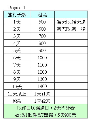 出租商品及報價 GoPro出租 首頁 > 商品 > GoPro出租 > GoPro Hero 11 出租 GoPro Hero 11 出租 系統報價已包含取還2天不計費,請於出國前1天取件,回程資料儲存好,隔天再歸還 1.取還日期及地點 取件日 歸還日 數量 取件方式 宅配收送 店取店還 取還地點 台北特約門市(台北 大同區-民權西路) 高雄特約門市(高雄 新興區-八德一路) 行程 請選擇 陸地、雪地旅遊、無下水 玩水、浮潛、海底漫步、體驗潛水15米以內 有執照潛水、超過15米到40米內深潛 2.加租配件 原廠電池 (+30 / 天) 256G記憶卡Samsung (+20 / 天) 漂浮棒+漂浮手環 (+10 / 次) 三向自拍棒 (+10 / 次) 防霧插片 (+50 / 次) 紅色濾鏡 (+10 / 天) 3件式濾鏡 (+20 / 天) 淡紅色濾鏡 (+10 / 天) 紫色濾鏡 (+10 / 天) 潛水手電筒 (+40 / 天) 分水鏡 (+30 / 天) 原廠迷你腳架 (+20 / 天) 270自拍棒 (+30 / 天) 背包夾 (+10 / 天) 手腕帶 (+10 / 天) 頸圈 (+10 / 天) 胸帶 (+10 / 天) 頭帶 (+10 / 天) 底座貼片- 曲面 (+10 / 次) 底座貼片- 平面 (+10 / 次) 單車夾 (+10 / 天) 萬向蟹夾 (+20 / 天) 機車夾 (+10 / 天) 一般腳架 (+10 / 天) 旋轉雲台 (+10 / 天) 三腳吸盤架 (+10 / 天) 防潑水袋 (+10 / 次) 浮潛面罩(小號/女用) (+30 / 天) 防曬水母衣-請備註size (+10 / 天) 蛙鞋-請備註size (+20 / 天) 蛙鏡-請備註度數 (+20 / 天) 乾式呼吸管 (+10 / 天) 行動電源 (+10 / 天) 行李秤 (+10 / 天) 3.獨家安心保障(說明頁面) 安心保障 (海底機負擔50%責任損失) +100元/次 4.租金試算 預約天數 2 GoPro Hero 11 出租 2天 * 1組 = 600 總計 600 加入購物車 GoPro Hero 11 出租(海陸兩用大全配) 出租標準配件:Gopro Hero11 Black主機/記憶卡128G+64G備用(U3)/邊框保護殼/安裝扣/原廠電池2顆/旅充/座充-3插槽/傳輸線/讀卡機/防水殼/92cm防水自拍棒/說明書/鏡頭保護蓋/收納包 優惠活動:漂浮棒或三向自拍棒,加租10/次 參考資料:說明書 、錄影及時間、影像編輯Quick 商品詳細介紹 強大的GoPro HERO11 Black記錄精彩冒險。搭載前後LCD螢幕,方便完美取景,加上全新感光元件,帶來HERO相機有史以來最寬闊高挑的視野。 *以上資訊及圖片示意僅供參考,如有誤植請依官方網站或實際商品為主 參考資料: Gopro hero11_說明書_海底機.pdf