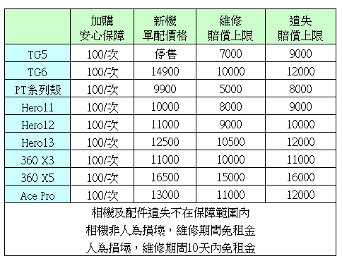 加100元/ 次,可享有安心保障服務(50%責任損失),除相機遺失、摔壞、外力造成損壞,以外之任何損壞均在保障服務範圍內,包含相機入水,損壞產生的維修費用,依照原廠維修中心報價,由我們替您負擔 50%費用