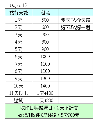 出租商品及報價 GoPro出租 首頁 > 商品 > GoPro出租 > GoPro Hero 12 出租 GoPro Hero 12 出租 系統報價已包含取還2天不計費,請於出國前1天取件,回程資料儲存好,隔天再歸還 1.取還日期及地點 取件日 歸還日 數量 取件方式 宅配收送 店取店還 取還地點 台北特約門市(台北 大同區-民權西路) 高雄特約門市(高雄 新興區-八德一路) 行程 請選擇 陸地、雪地旅遊、無下水 玩水、浮潛、海底漫步、體驗潛水15米以內 有執照潛水、超過15米到40米內深潛 2.加租配件 原廠電池 (+30 / 天) 256G記憶卡Samsung (+20 / 天) 漂浮棒+漂浮手環 (+10 / 次) 三向自拍棒 (+10 / 天) 防霧插片 (+50 / 次) 紅色濾鏡 (+10 / 天) 淡紅色濾鏡 (+10 / 天) 紫色濾鏡 (+10 / 天) 3件式濾鏡 (+20 / 天) 潛水手電筒 (+40 / 天) 分水鏡 (+30 / 天) 原廠迷你腳架 (+20 / 天) 270自拍棒 (+30 / 天) 背包夾 (+10 / 天) 手腕帶 (+10 / 天) 頸圈 (+10 / 天) 胸帶(適合滑雪使用) (+10 / 天) 頭帶 (+10 / 天) 底座貼片- 曲面 (+10 / 次) 底座貼片- 平面 (+10 / 次) 單車夾 (+10 / 天) 萬向蟹夾 (+20 / 天) 機車夾 (+10 / 天) 一般腳架 (+10 / 天) 旋轉雲台 (+10 / 天) 三腳吸盤架 (+10 / 天) 防潑水袋 (+10 / 次) 浮潛面罩(小號/女用) (+30 / 天) 防曬水母衣-請備註size (+10 / 天) 蛙鞋-請備註size (+20 / 天) 蛙鏡-請備註度數 (+20 / 天) 乾式呼吸管 (+10 / 天) 行動電源 (+10 / 天) 行李秤 (+10 / 天) 3.獨家安心保障(說明頁面) 安心保障 (海底機負擔50%責任損失) +100元/次 4.租金試算 預約天數 3 GoPro Hero 12 出租 3天 * 1組 = 700 總計 700 加入購物車 GoPro Hero 12 出租(海陸兩用大全配) 出租標準配件:Gopro Hero12 Black主機/記憶卡128G+64G備用(U3)/邊框保護殼/安裝扣/原廠電池2顆/旅充/座充-3插槽/傳輸線/讀卡機/防水殼/92cm防水自拍棒/說明書/鏡頭保護蓋/收納包 優惠活動:漂浮棒+漂浮手環,加租10/次 參考資料:說明書 、錄影及時間、影像編輯Quick Gopro Hero12 Black 運動相機,商品介紹: ※以上資訊及圖片示意僅供參考,如有誤植請依官方網站或實際商品為主,謝謝。 參考資料: HERO12Black說明書-海底機.pdf