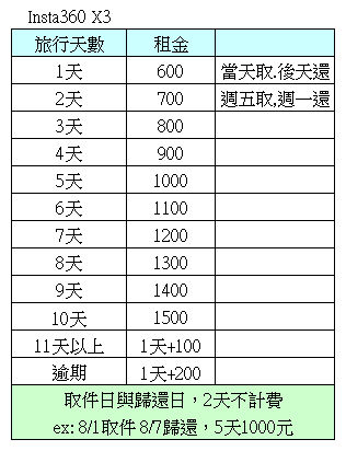 出租商品及報價 Insta360 X 出租 首頁 > 商品 > Insta360 X 出租 > Insta360 X3 全景相機出租 Insta360 X3 全景相機出租 系統報價已包含取還2天不計費,請於出國前1天取件,回程資料儲存好,隔天再歸還 1.取還日期及地點 取件日 歸還日 數量 取件方式 宅配收送 店取店還 取還地點 台北特約門市(台北 大同區-民權西路) 高雄特約門市(高雄 新興區-八德一路) 行程 請選擇 陸地、雪地旅遊、無下水 玩水、浮潛、海底漫步、體驗潛水15米以內 有執照潛水、超過15米到40米內深潛 2.加租配件 原廠電池 (+20 / 天) 256G記憶卡SanDisk (+20 / 天) 迷你腳架HRR (+10 / 天) 機車夾 (+10 / 天) 萬向蟹夾 (+20 / 天) USB讀卡器 (+10 / 次) 防潑水袋 (+10 / 次) 行動電源 (+10 / 天) 3.獨家安心保障(說明頁面) 安心保障 (海底機負擔50%責任損失) +100元/次 4.租金試算 預約天數 2 Insta360 X3 全景相機出租 2天 * 1組 = 700 總計 700 加入購物車 Insta360 X3 出租 出租標準配件:相機主機/原廠電池2顆/記憶卡128G (U3)/鏡頭保護鏡/相機保護套/旅充/座充/傳輸線/120cm隱形自拍棒/說明書/收納包 參考資料:說明書、錄影及時間、桌機版官方軟體 ※本商品只提供陸地、雪地上使用 ※主機僅能防潑水或雨水,請勿裸機下水 ※若須下水,請使用Gopro加防水殼 Insta360 X3 全景運動相機 Insta360 X3 是一款新世代口袋全景運動相機。具有360°全景拍攝功能、為運動而設計的硬體,以及AI智能軟體,令捕捉和分享生活變得更容易且有趣。 配備全新 1/2″ 感光元件、2.29″ 觸控螢幕及多款創新功能,支援運動 HDR 拍攝 5.7K 全景影片、7200萬畫素照片,高清記錄當下所有景象。後製時還能透過 Insta360 App中的AI剪輯工具,自由取景和隨心構圖,充分釋放全景影像創造力。 *以上資訊及圖片示意僅供參考,如有誤植請依官方網站或實際商品為主